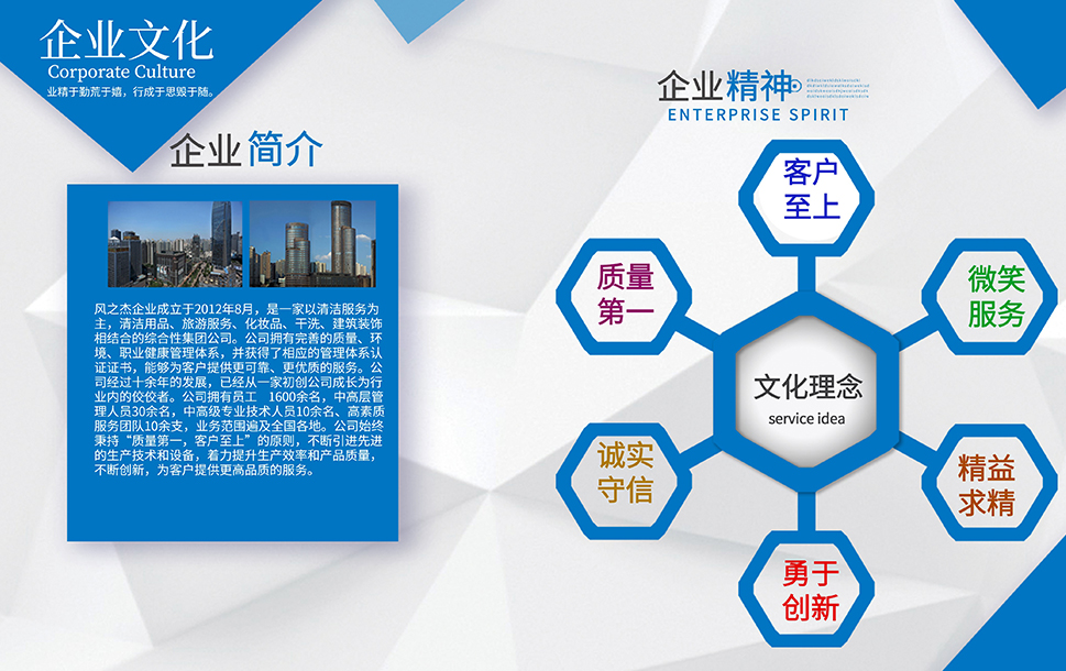 公司是一家以清潔服務(wù)為主,旅游,干洗、化妝品、裝修和餐飲相結(jié)合的多元化發(fā)展運營的服務(wù)性企業(yè)。企業(yè)本著誠信第一、服務(wù)至上的原則,依靠公司盡我所能、力我所及的信條從2012年到現(xiàn)在服務(wù)了多家企業(yè),現(xiàn)在我們已經(jīng)擁有了400家左右的清潔服務(wù)項目和多家洗衣店。我們會一直牢記服務(wù),創(chuàng)新才是我們企業(yè)發(fā)展的服務(wù)宗旨。
